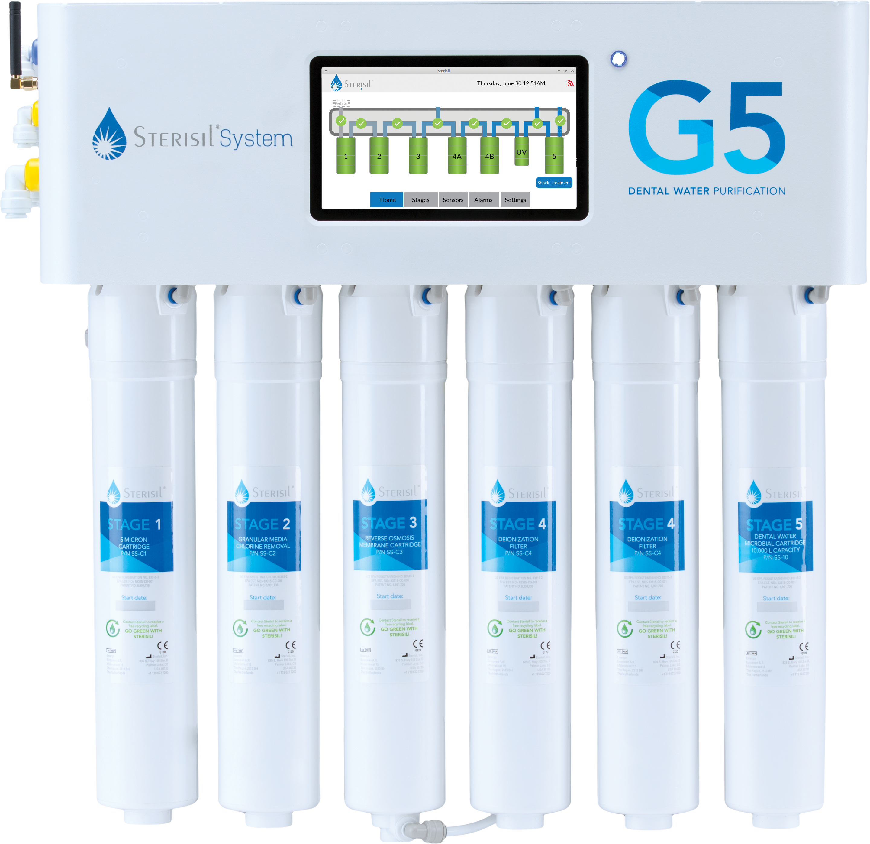 The Sterisil® System G5 continually examines the state of your System to ensure quality and efficiency. All System readings including cartridge life, cartridge performance, water usage and many more are sent via Wi-Fi or Ethernet to a local PC for convenient monitoring. The System is equipped with audible